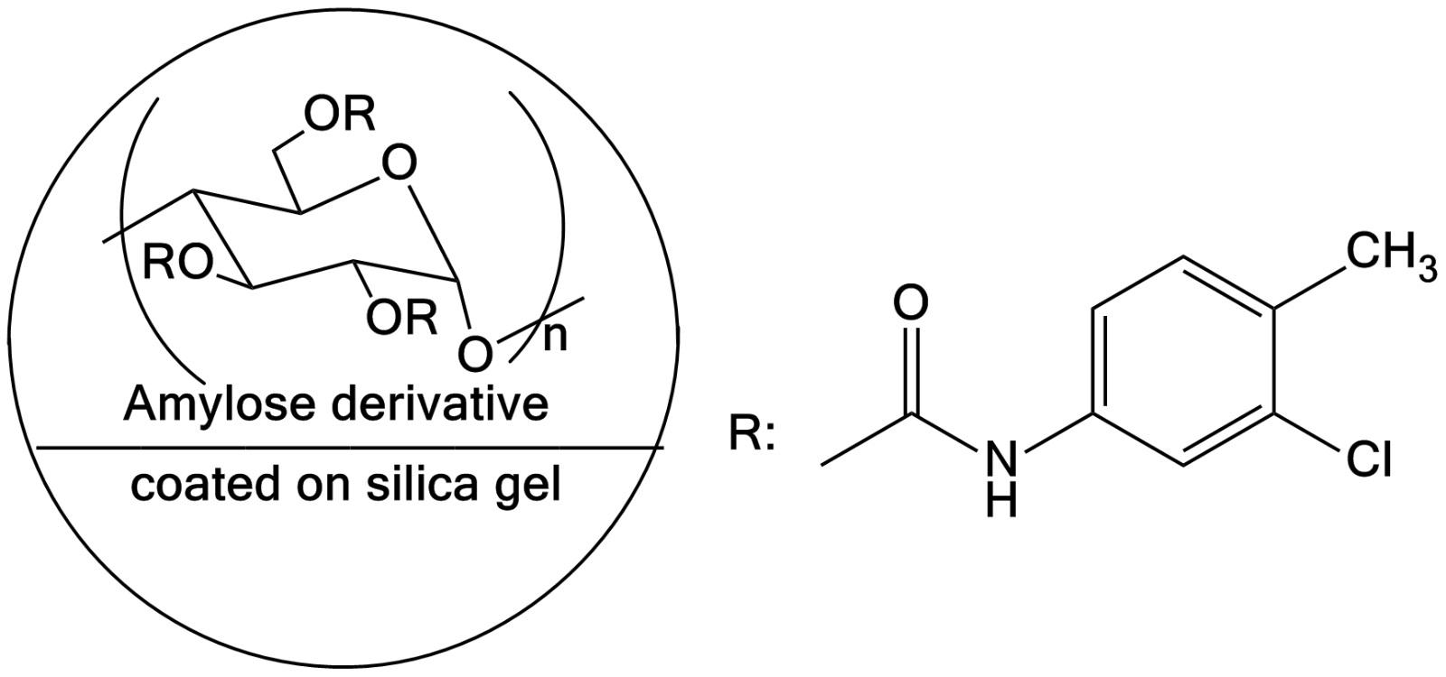 纖維素型是使用最廣泛的手性柱之一,纖維素型手性色譜柱的分離作用包括相互吸引的作用及形成包埋復(fù)合物。它們屬于Wainer分類(lèi)中的第2種類(lèi)型。市售的手性色譜柱為微晶三醋酸基、三安息香酸基、三苯基氨基酸鹽纖維素固定相。很多化合物可通過(guò)此類(lèi)型的色譜柱得到分離。這種類(lèi)型的手性色譜柱種類(lèi)也很齊全。流動(dòng)相使用低極性溶劑,典型的流動(dòng)相為異丙醇-正己烷混合物。這類(lèi)柱子根據(jù)制作工藝,分為涂敷與鍵合兩大類(lèi)。但特別要注意由于氯可以使涂敷纖維素從硅膠上脫落,因此要確保涂敷類(lèi)柱子流動(dòng)相中無(wú)含氯溶劑。