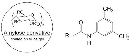 纖維素型是使用最廣泛的手性柱之一,纖維素型手性色譜柱的分離作用包括相互吸引的作用及形成包埋復(fù)合物。它們屬于Wainer分類中的第2種類型。市售的手性色譜柱為微晶三醋酸基、三安息香酸基、三苯基氨基酸鹽纖維素固定相。很多化合物可通過此類型的色譜柱得到分離。這種類型的手性色譜柱種類也很齊全。流動相使用低極性溶劑,典型的流動相為異丙醇-正己烷混合物。這類柱子根據(jù)制作工藝,分為涂敷與鍵合兩大類。但特別要注意由于氯可以使涂敷纖維素從硅膠上脫落,因此要確保涂敷類柱子流動相中無含氯溶劑。